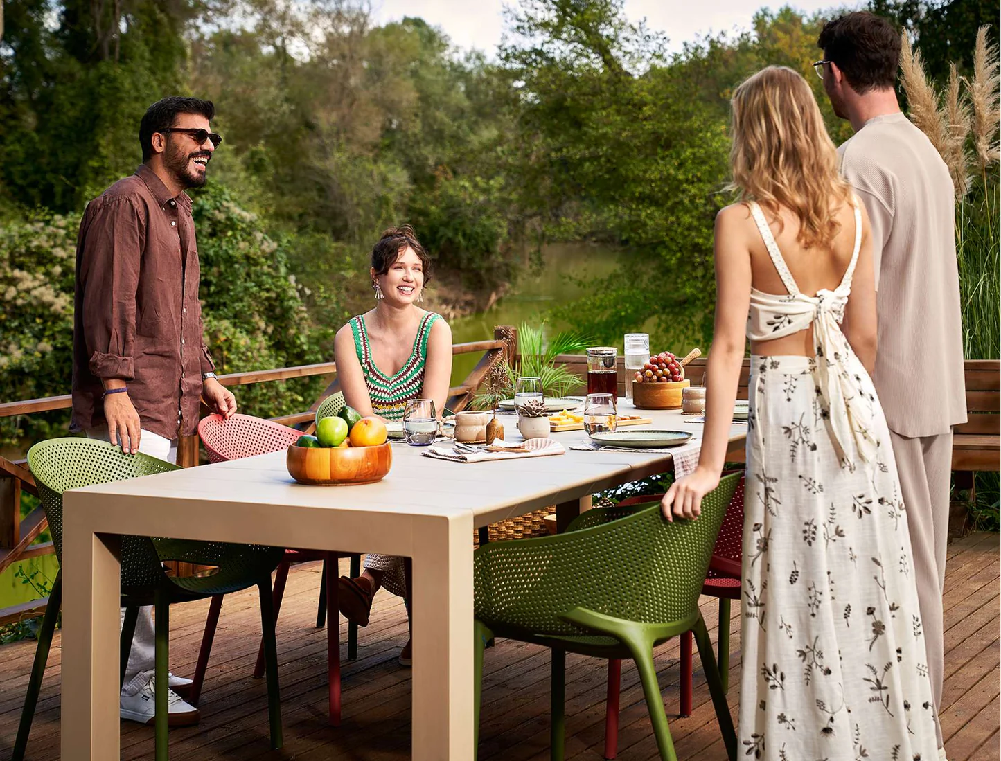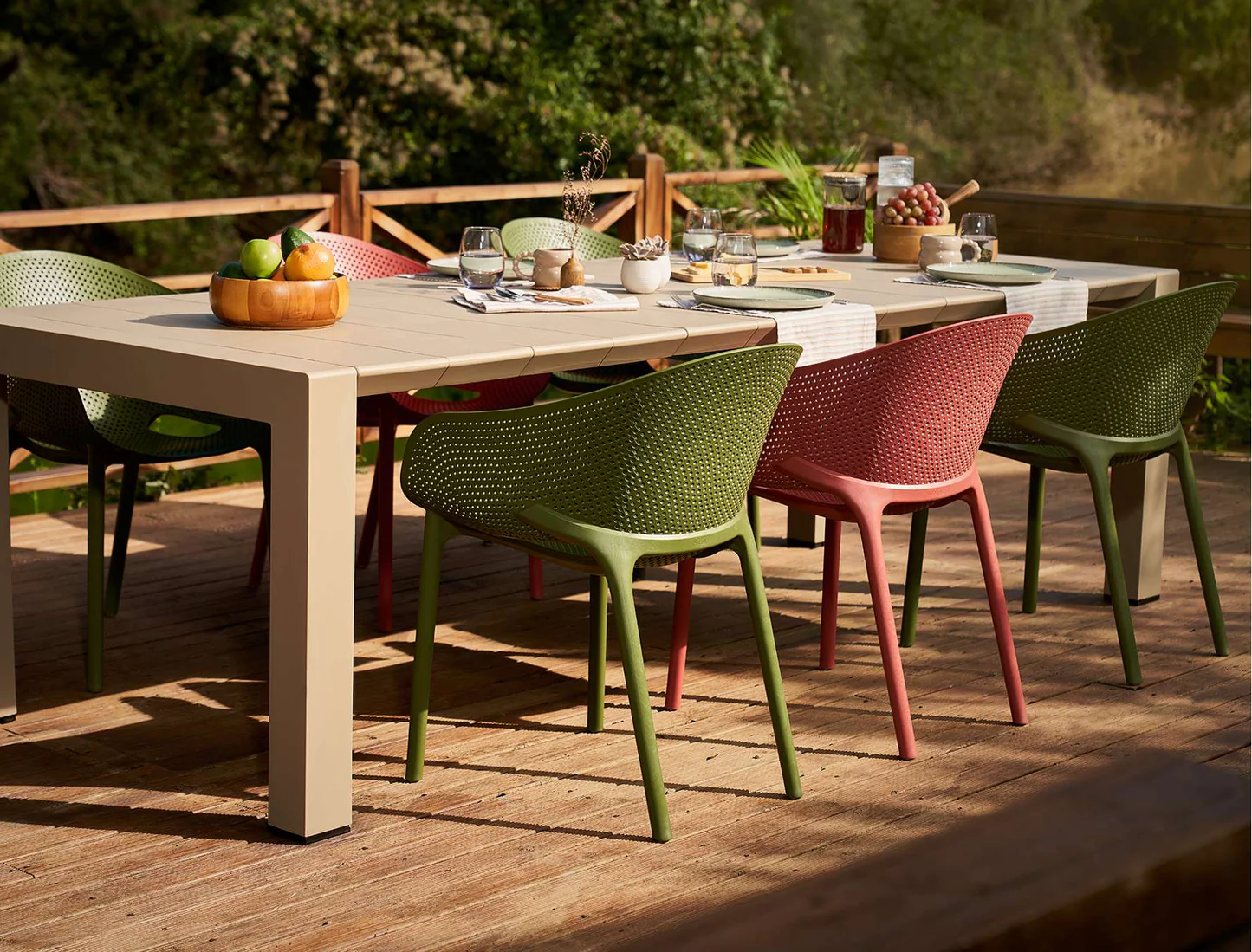 Стол Vegas с раздвижной столешницей размером 180/220 см. и 8 кресел Sky Pro из стеклопластика, устойчивого к воздействию солнца и атмосферным осадкам.